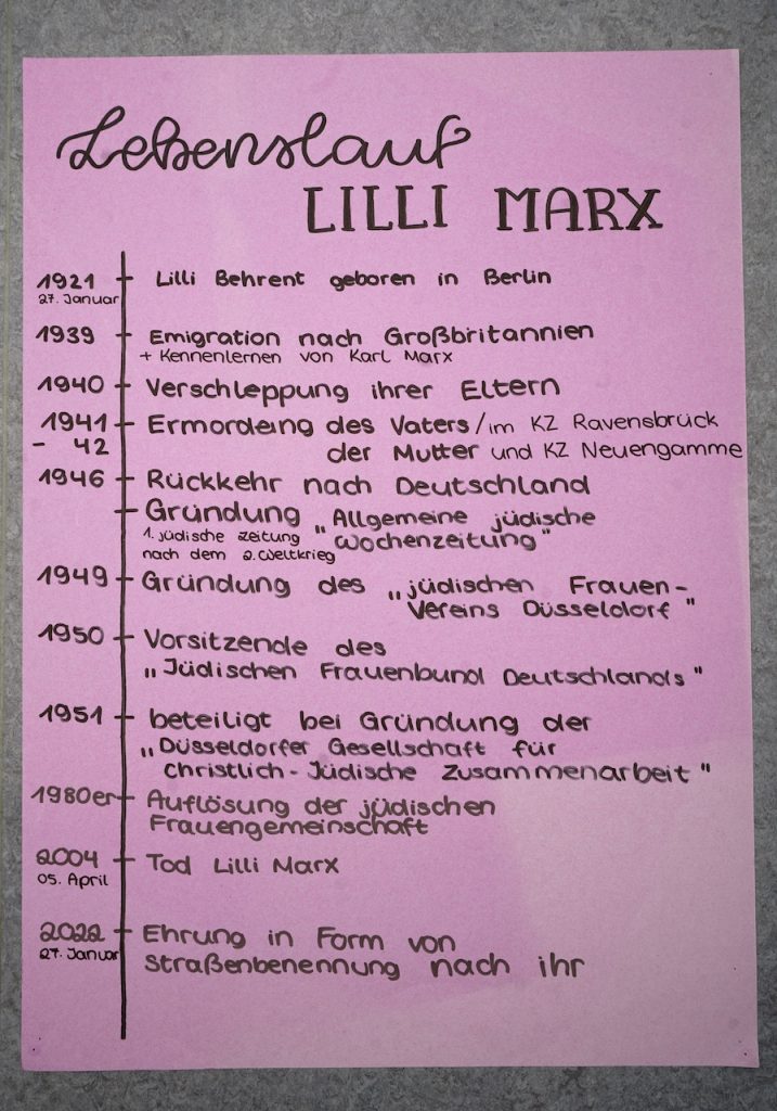 Die Klasse 10a des Annette-von-Droste-Hülshoff-Gymnasiums Benrath hat mit viel Kreativität und Engagement eine beeindruckende Ausstellung zu Ehren von Lilli Marx gestaltet. Jedes Kunstwerk erzählt eine einzigartige Geschichte. Unter anderem eine Collage über Lilli Marx und ihren Organisationen, eine 3D-gedruckte Lilli Marx-Figur und vieles mehr.